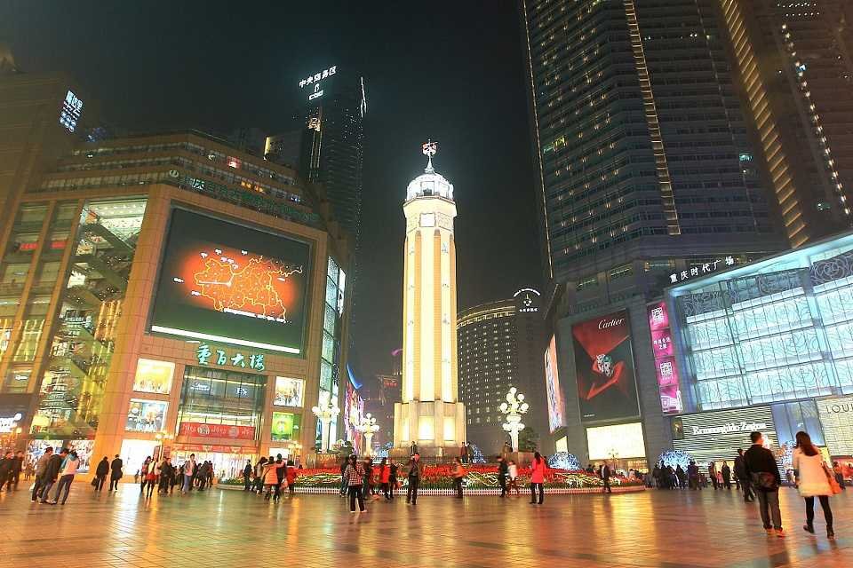 The Liberation Monument (shopping district) is Chongqing’s first commercial zone to exceed ¥50 billion in annual retail sales. It hosts 15 major malls (e.g., Times Square, Guotai Plaza) covering 2.62 million m², with 100+ international brands like LV and Gucci, earning it the title “Golden Cross Street”. - 24/7 Vibrancy: